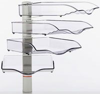 Материал: высококачественный пластик. Независимое вращение на 360 градусов. За счет ступенчатой волны на внутренней поверхности лотка облегчается доступ к бумагам. В комплект входят пластиковые табуляторы с бумажной вставкой. Крепятся к столу с помощью струбцины. Резиновые микроножки прочно удерживают лоток на поверхности стола, в случае классического способа установки.